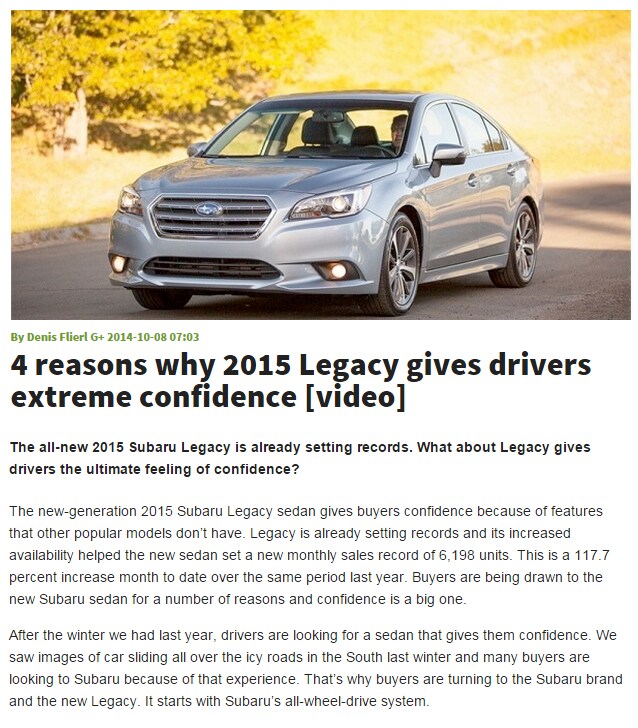 (Source: 4 reasons why 2015 Legacy gives drivers extreme confidence [video], TorqueNews, October 08, 2014)